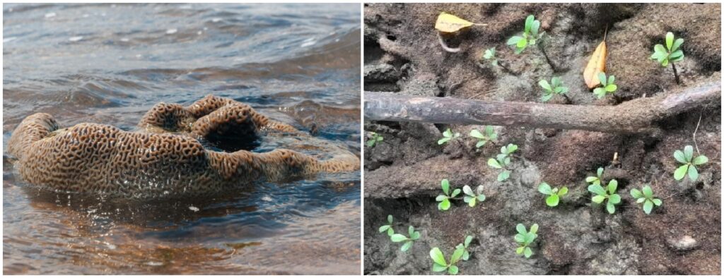 Vpravo: V okolí ostrova Kwangan a vesnice Pantai Lango nacházíme ve velkém počtu semenáčky mangrovu Camptostemon philippinensis, které se v zálivu přirozeně šíří. Tento vzácný druh stromu je zařazen na Červený seznam IUCN jako ohrožený.